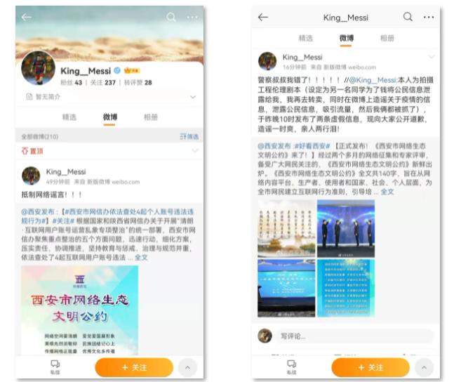 11月14日,接网民举报,微博账号“King_Messi”用户在微博上发布“国外留学生回国核酸检测结果复阳及其行程记录”“雁塔区林女士及家人隐瞒疫情地区旅居史造成西安某小区被隔离”等两条涉疫情防控虚假信息,引发市民担忧。经西安市网信办第一时间调查核实,该账号持有人为西安某高校学生,为拍摄剧本、博取关注,虚构并发布上述不实信息,造成不良社会影响。其行为违反了《网络信息内容生态治理规定》《互联网用户公众账号信息内容服务管理规定》等法规。根据其违规事实,网信、公安部门依法对该账号持有人进行了警告训诫,指出其错误事实及危害,要求其公开承认错误并认真学习落实网络生态治理相关法律法规,账号停止内容更新10天,该账号持有人表示将认真汲取教训,虚心接受处罚,严格遵守法律法规,合规守法运营个人账号,自觉抵制网络谣言。