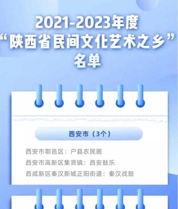 陕西命名40个“陕西省民间文化艺术之乡” 西安有3个近日,陕西省文化和旅游厅印发《关于命名2021—2023年度“陕西省民间文化艺术之乡”的通知》,西安市3个县(市、区)、乡镇(街办)入选为2021-2023年度“陕西省民间文化艺术之乡”,分别为:鄠邑区(户县农民画)、高新区集贤镇(西安鼓乐),以及西咸新区秦汉新城正阳街道(秦汉战鼓)。(记者 曾世湘)