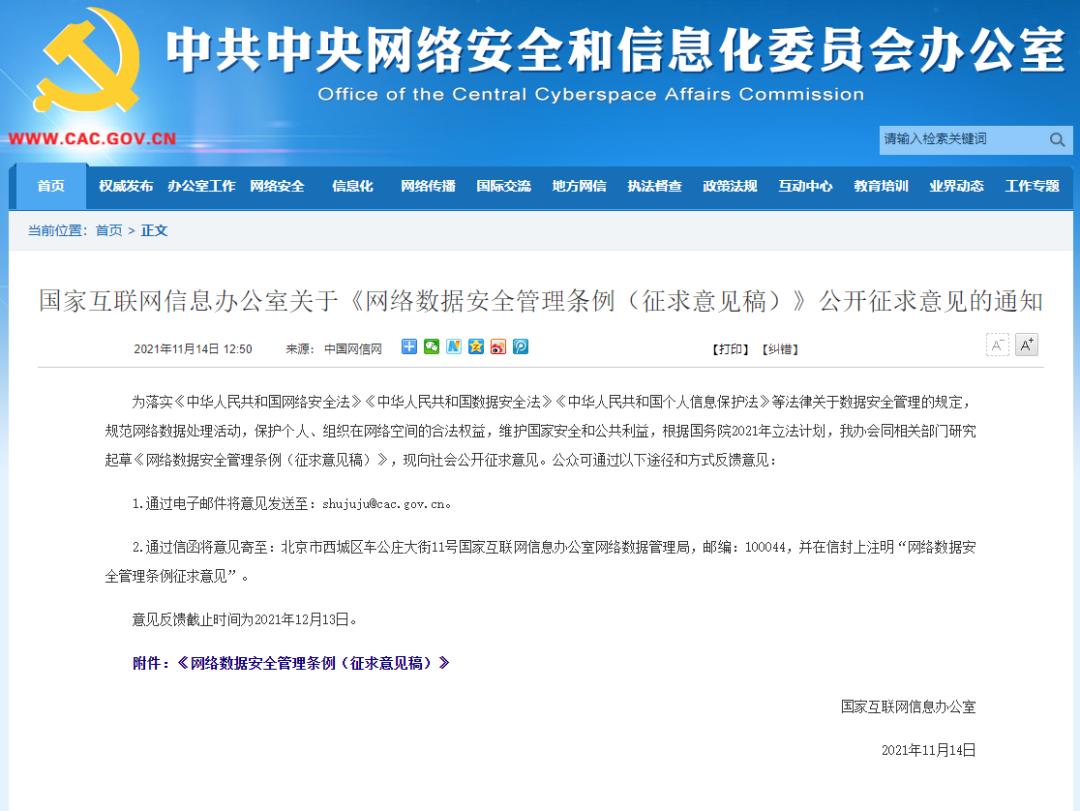 网信办拟规定:人脸指纹等不得作为唯一身份认证14日,国家网信办发布关于《网络数据安全管理条例(征求意见稿)》公开征求意见的通知。《意见稿》提出,数据处理者利用生物特征进行个人身份认证的,应当对必要性、安全性进行风险评估,不得将人脸、步态、指纹、虹膜、声纹等生物特征作为唯一的个人身份认证方式,以强制个人同意收集其个人生物特征信息。