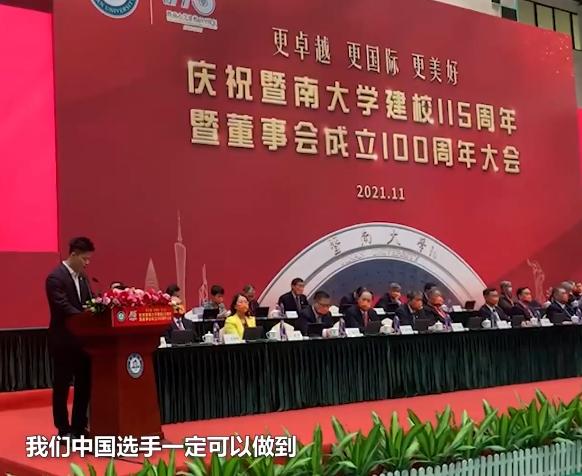 11月14日,在暨南大学115周年校庆大会上,苏炳添作为教师代表讲话。在2020东京奥运会上,苏炳添跑出了9秒83的成绩,成为第一个跑进奥运男子百米决赛的亚洲人。发言中,苏炳添打趣道:“我也很高兴通过我的努力,让母校成为中国独一无二的‘983大学’。希望会有越来越多的中国人、暨南人在世界舞台上跑出中国速度。”