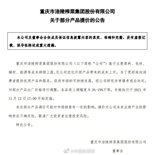 11月14日,涪陵榨菜发布关于部分产品提价的公告,基于主要原料、包材、辅材、能源等成本持续上涨,及公司优化升级产品带来的成本上升,为了更好地向消费者提供优质产品和服务,公司对部分产品出厂价格进行调整,各品类上调幅度为3%-19%不等,价格执行于2021年11月12日17:00开始实施。