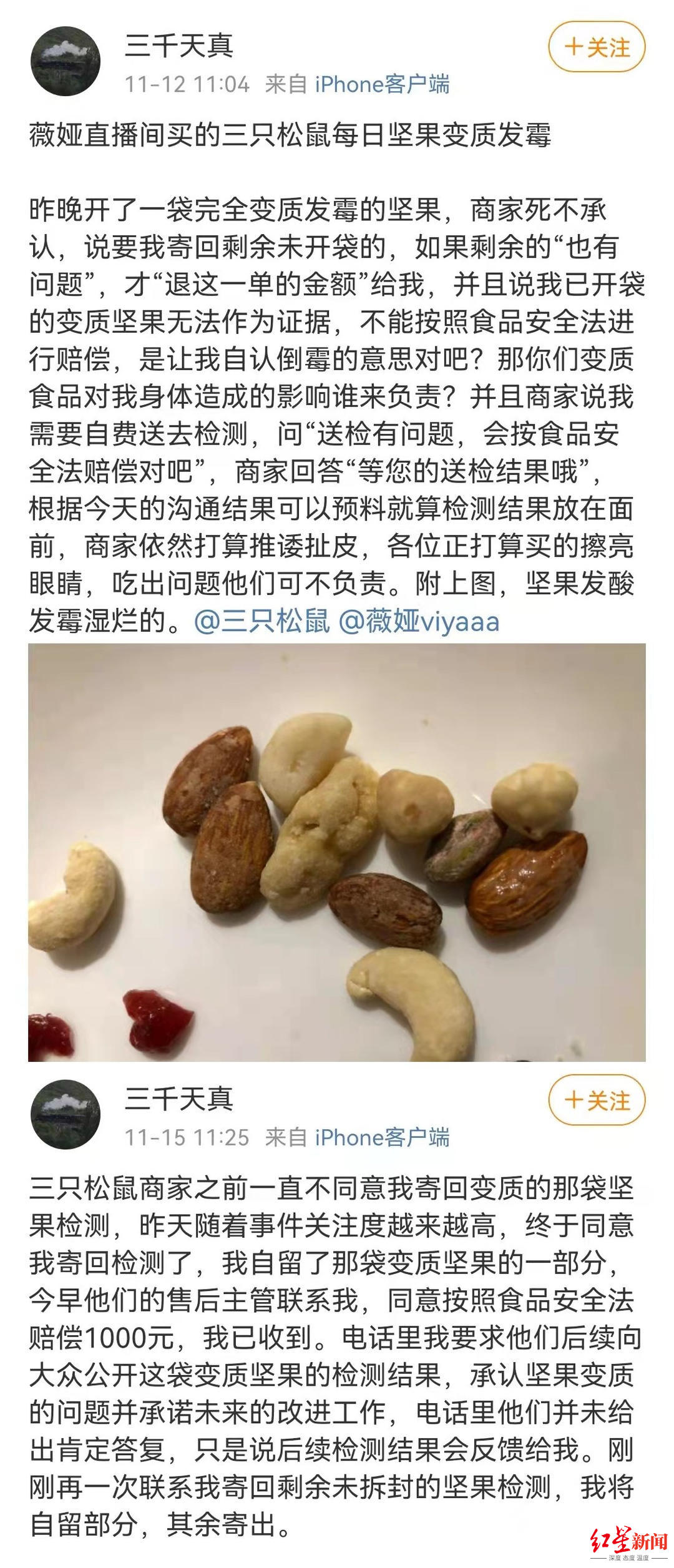 随着事情的不断发酵,三只松鼠有了进一步动作。据网友@三千天真 微博透露,三只松鼠于11月14日同意将发霉坚果寄回检测,并赔偿其1000元,而对于其提出的向大众承认坚果变质的问题没有肯定答复。