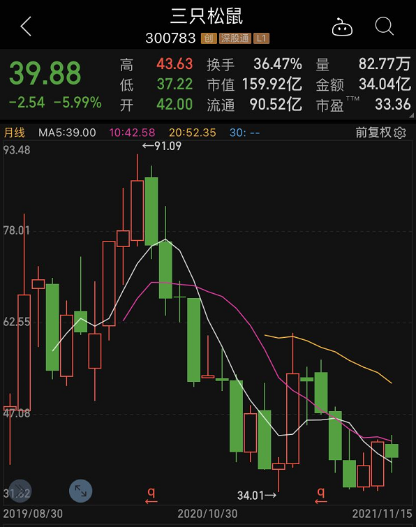但2020年6月以来,三只松鼠股价持续下跌,2021年3月份跌至最低的34.01元/股,跌幅超过60%。截至11月15日收盘,三只松鼠报39.88元/股,最新市值只有160亿元,较高点缩水200亿元。