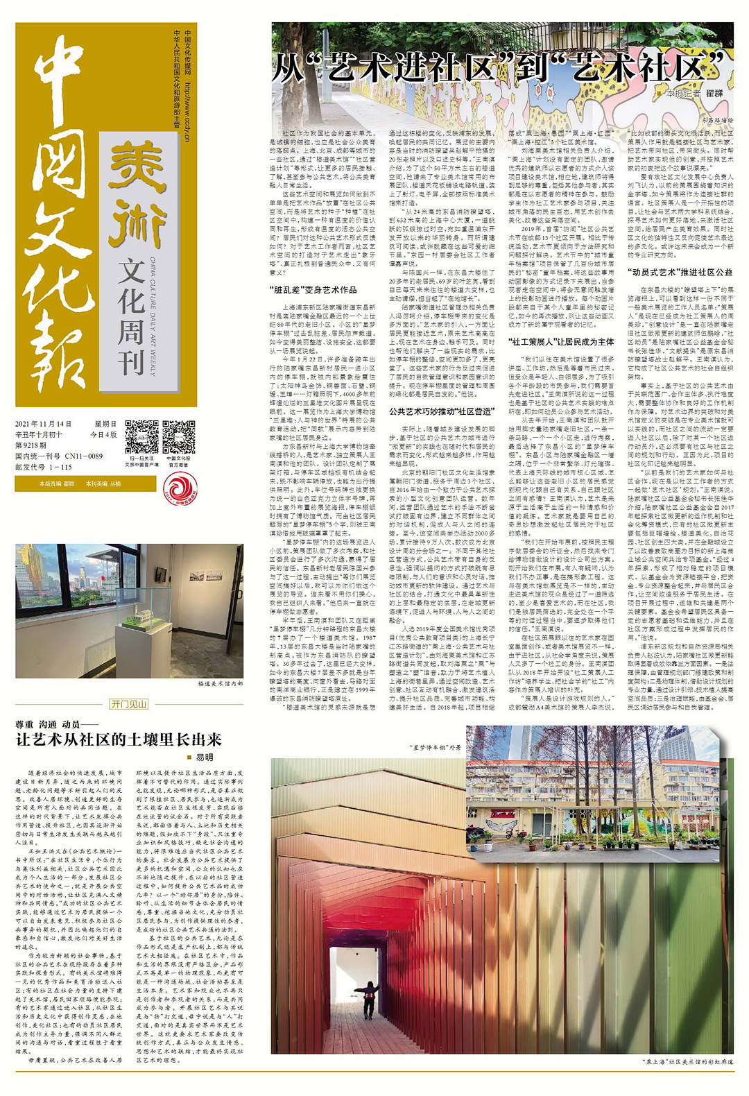 社区作为我国社会的基本单元,是城镇的细胞,也应是社会公众美育的落脚点。上海、北京、成都等城市的一些社区,通过“楼道美术馆”“社区营造计划”等形式,让更多的居民接触、了解,甚至参与公共艺术,将公共美育融入日常生活。