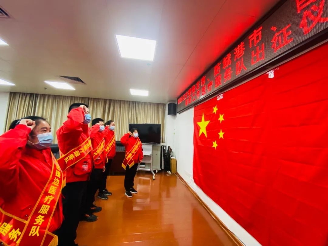 兴宾区援边医疗服务队向国旗庄严宣誓。当前境外疫情形势异常严峻,广西边境口岸人流物流量大,外防输入任务极为繁重。为充实边境疫情防控力量,守好祖国南大门,兴宾区医疗服务队即将奔赴抗疫一线,开展为期三个月的抗疫和医疗救治工作。此次支援广西边境疫情防控工作的5名医务人员,分别是来自兴宾区人民医院的吴胜强、兴宾区妇幼保健院的罗秋琼、八一医院的覃凤金、小平阳镇中心卫生院的韦天茵、迁江镇中心卫生院的覃庆武。