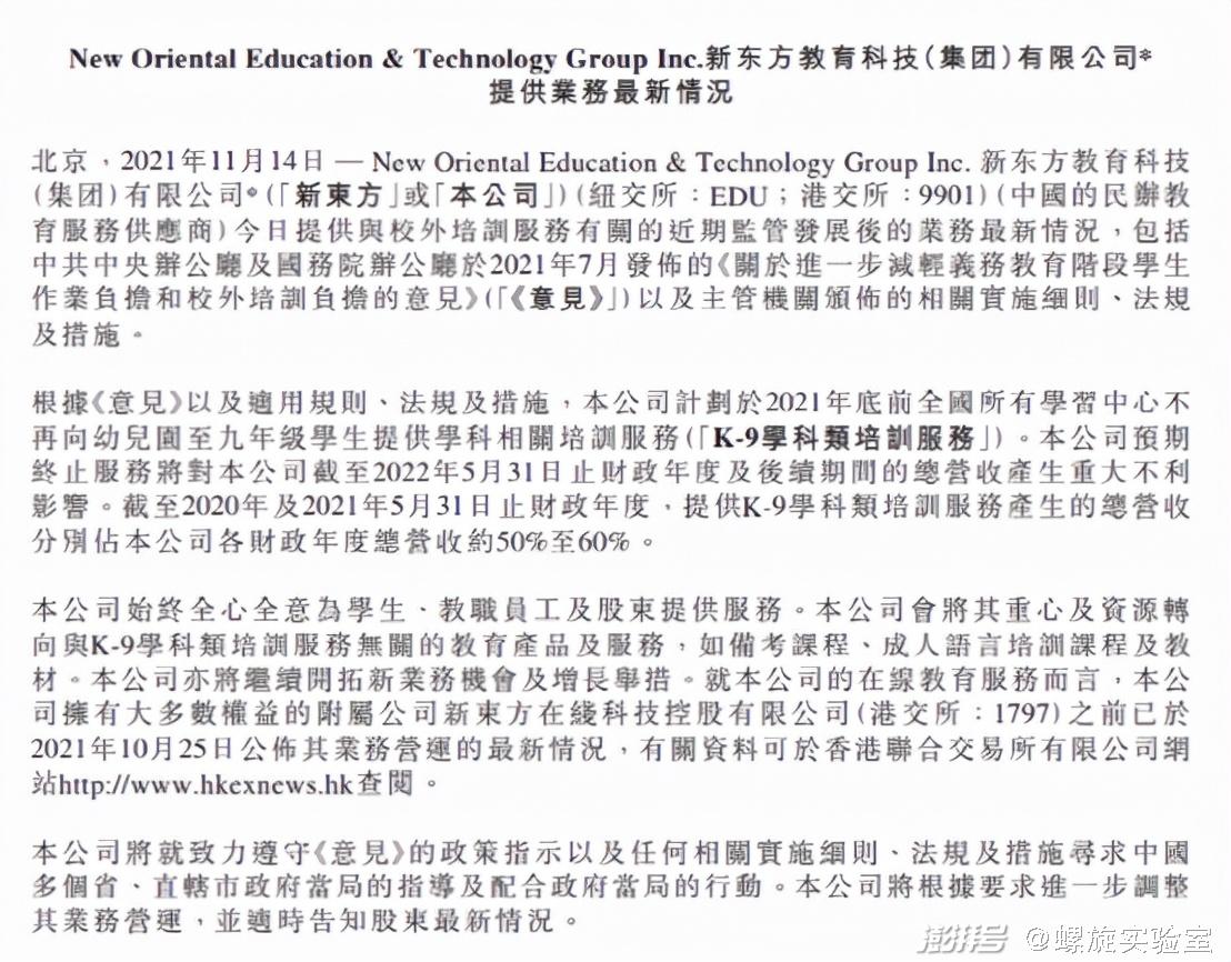 再看新东方,同样也在朝着素质教育方向转型。9月中,新东方宣布关闭在线旗下K12业务,紧接着在11月中,新东方再次宣布将于2021年底前停止全国所有学习中心的K-9学科辅导服务。
