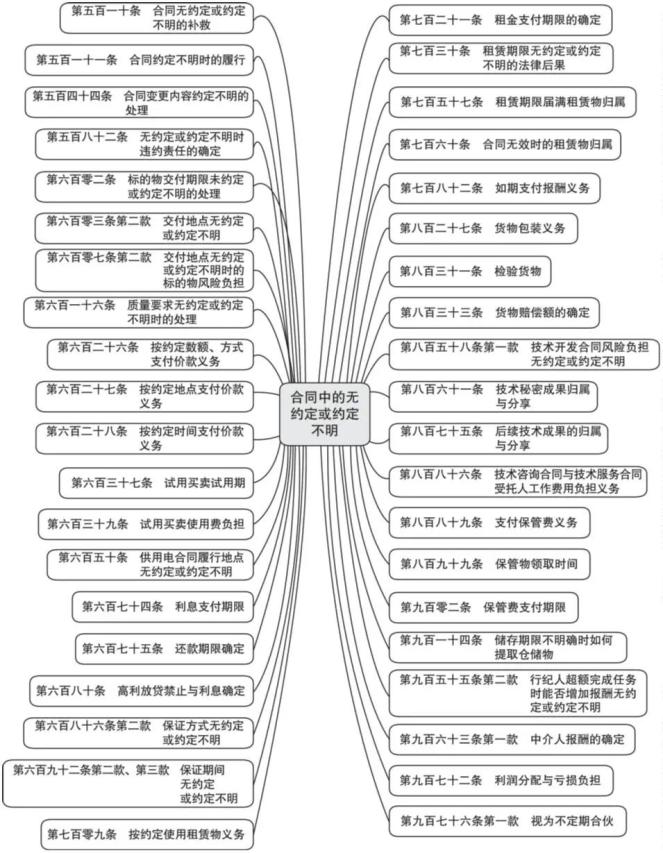 4. 以下是关于本词条其他各条文的收录指引:第544条【变更不明推定为未变更】收录于“合同变更”词条;第582条【违约责任无约定或约定不明】收录于“不同违约责任承担方式”词条;第602条【交付期限无约定或约定不明】收录于“出卖人义务词条”;第603条第2款【交付地点无约定或约定不明】收录于“出卖人义务”词条;第607条第2款【交付地点无约定或约定不明时标的物风险负担】收录于“风险负担”词条;第616条【标的物质量无约定或约定不明】收录于“出卖人义务”词条;第626条【价款数额与支付方式无约定或约定不明】收录于“买受人义务”词条;第627条【支付价款地点无约定或约定不明】收录于“买受人义务”词条;第628条【价款支付时间无约定或约定不明】收录于“买受人义务”词条;第637条【试用买卖试用期无约定或约定不明】收录于“特殊买卖”词条;第639条【试用买卖使用费无约定或约定不明】收录于“特殊买卖”词条;第674条【借款利息支付期限无约定或约定不明】收录于“借款合同涉利息规定”词条;第675条【借款期限无约定或约定不明】收录于“借款合同涉期限规定”词条;第680条【借款利息无约定或约定不明】收录于“借款合同涉利息规定”词条;第686条第2款【保证方式无约定或约定不明】收录于“保证方式”词条;第692条第2、3款【保证期间无约定或约定不明】收录于“保证期间”词条;第709条【租赁物使用方式无约定或约定不明】收录于“承租人义务与责任”词条;第721条【租金支付期限无约定或约定不明】收录于“承租人义务与责任”词条;第730条【租赁期限无约定或约定不明】收录于“租赁期限”词条;第757条【租赁期届满租赁物归属无约定或约定不明】收录于“融资租赁中租赁物归属”词条;第760条【融资租赁合同无效租赁物归属无约定或约定不明】收录于“融资租赁中租赁物归属”词条;第782条【定作人支付报酬无约定或约定不明】收录于“定作人义务与责任”词条;第787条【运输合同中包装方式无约定或约定不明】收录于“托运人义务”词条;第831条【检验货物期限无约定或约定不明】收录于“提货与验货”词条;第833条【货物毁损灭失赔偿额无约定或约定不明】收录于“旅客伤亡与物品、货物毁损灭失”词条;第858条第1款【技术开发合同风险负担无约定或约定不明】收录于“技术合同中当事人义务”词条;第861条【技术秘密成果归属分享无约定或约定不明】收录于“技术成果权益归属”词条;第875条【后续技术成果归属分享无约定或约定不明】收录于“技术成果权益归属”词条;第886条【工作费用负担无约定或约定不明】收录于“技术合同中当事人义务”词条;第889条【保管合同保管费无约定或约定不明】收录于“寄存人义务”词条;第899条【保管期限无约定或约定不明】收录于“保管物领取”词条;第902条【保管费支付期限无约定或约定不明】收录于“寄存人义务”词条;第914条【储存期限无约定或约定不明】收录于“仓储物提取”词条;第955条第2款【行纪人超额完成任务时能否增加报酬无约定或约定不明】收录于“行纪人义务”词条;第963条第1款【中介人报酬无约定或约定不明】收录于“中介人报酬请求权”词条;第972条【合伙利润分配与亏损负担无约定或约定不明】收录于“合伙合同其他内容”词条;第976条第1款【合伙期限无约定或约定不明】收录于“合伙合同其他内容”词条。