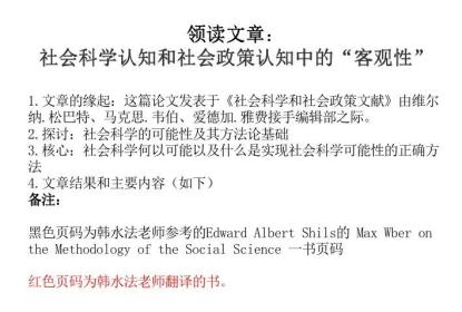 由于时间的关系,此领读将主要解读马克斯·韦伯的核心思想,以及其在现今社科研究方法中的诠释。书中部分例证部分,则会简要解释或跳过。但我根据中译文和英译文这两本书,以及个人的理解,将此篇文章中每段大意总结了下来,暂时分为四个部分。PPT上的黑色页码为英译文书中页码,红色为韩老师的中译文文本。如果各位老师和同学感兴趣的话,可以查阅,阅读,如有任何问题,请随时联系我,谢谢大家。
