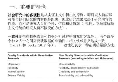 就回归到我们 PPT最开始,我们如何定义一篇好的社会研究的质量,它也有不同的指标和认可,例如 客观性、可靠性,普遍性,成果的可转移性等(见图)。整个研究从设计到分析结束,甚至内容表述,都是没有偏差,才能达到社会研究的客观性。书中的67页到68页是论点重述。即社会科学的客观性。