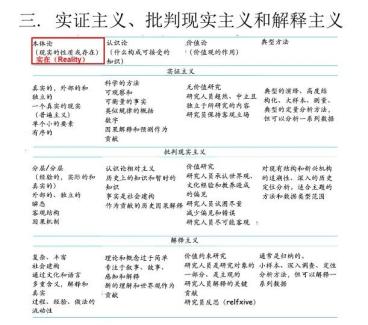 ▲图10现在我就来给大家进一步的去解释一下实证主义和解释主义的他们具体他们在本体论认识论和价值论,以及他们研究方法中的一些相似处和不同处(见图10)。其中,中间我加入了批判现实主义。就我个人的理解,批判现实主义是介于实证主义和解释主义,它们之间有一些相似性。