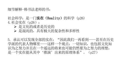 ▲图11例如,在韩老师这本书的26页,就写到:社会科学是一门实在的科学。在26-27页中页说到了,“因此我们一再看到——甚至在历史学派的代表人物哪里——这样一个观点:一切知识,也包括文化知识为之努力并且在一个遥远的将来也可能仍然要为之努力的理想,是一个实在能从其中‘推演’出来的原理体系”。这句话也进一步证明了马克斯·韦伯他的一个对于实在的认知,真实是存在的,人们需要通过一切的努力,并且可以发现全部的真实。