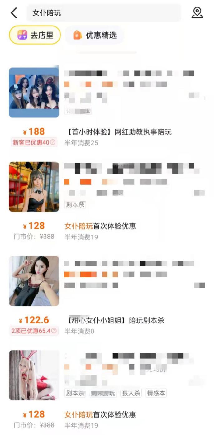 美团上搜索“女仆陪玩”等关键词,会出现大量女仆店铺信息,多以桌游店风格为主。但其中,不乏一些商家展示的助教照片尺度颇大,店铺品牌名字中带有明显挑逗字眼。甚至还有用户留言询问:可以身体接触吗?
