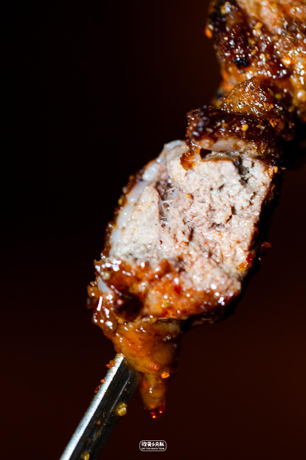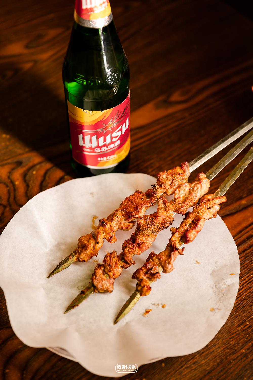 刚拿到手,还会滋滋冒油,肉香里带一点奶香,外面一层脆脆的焦皮,有烟熏出来的风味。正宗吃法是吃一口羊肉,喝一口夺命大乌苏。如果喜欢更肥的,还可以试试烤羊排。· 不卖素菜,几乎都是10元/串 ·