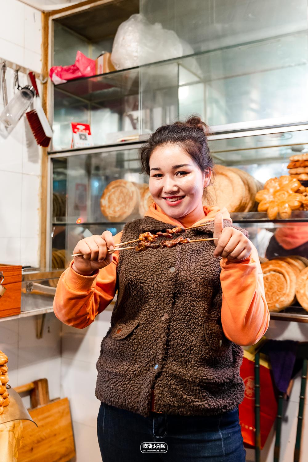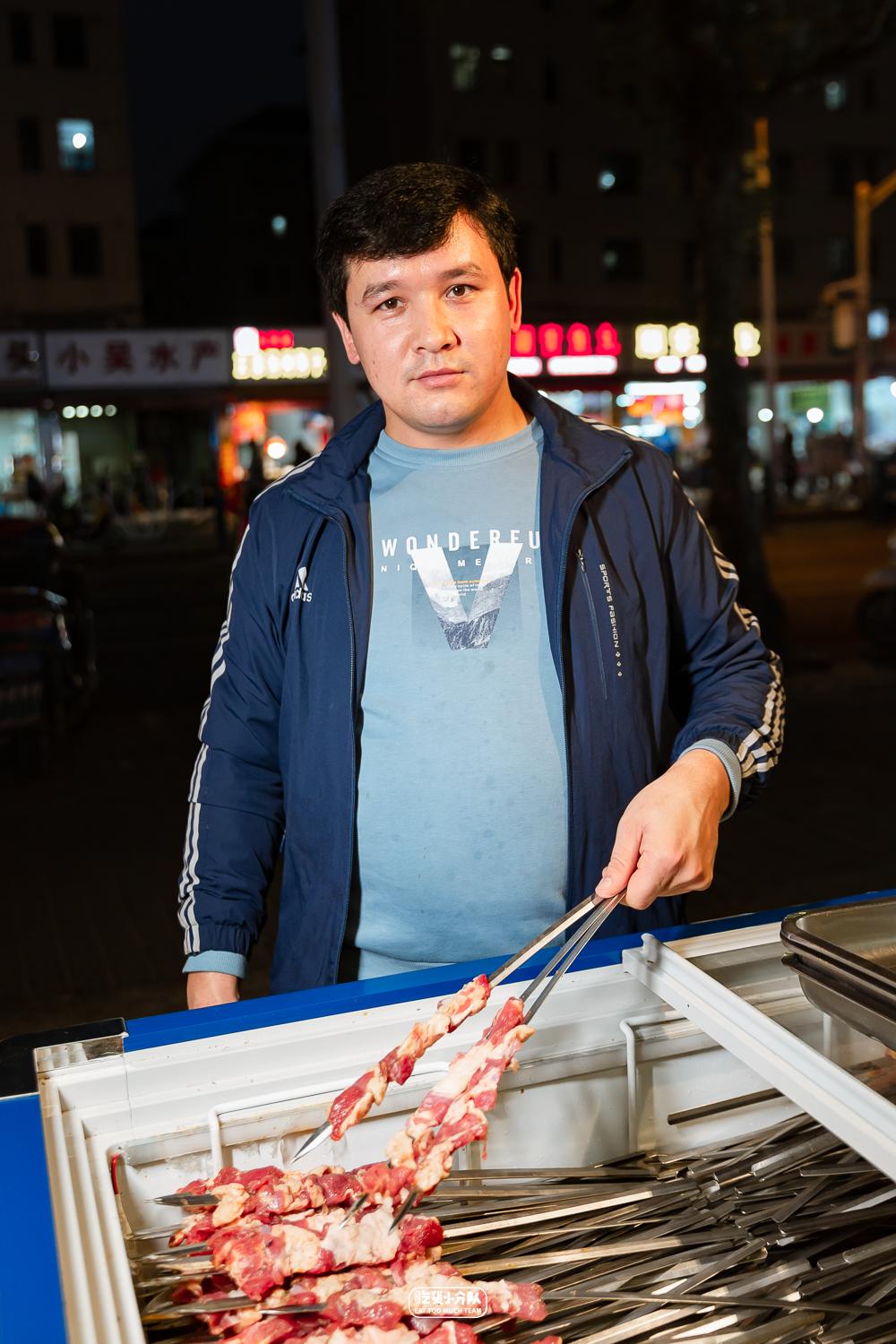 这里的羊肉串,1天最多能卖2000多串。羊肉用的是喀什绵羊,更嫩一点。为了更入味,都有提前腌制过。像其他正宗的新疆羊肉串一样,肉都是大块大块的,瘦肉粒中间穿插着一些羊油。