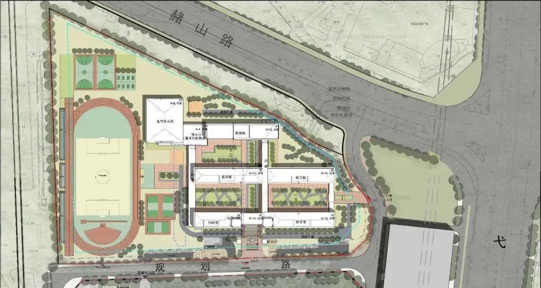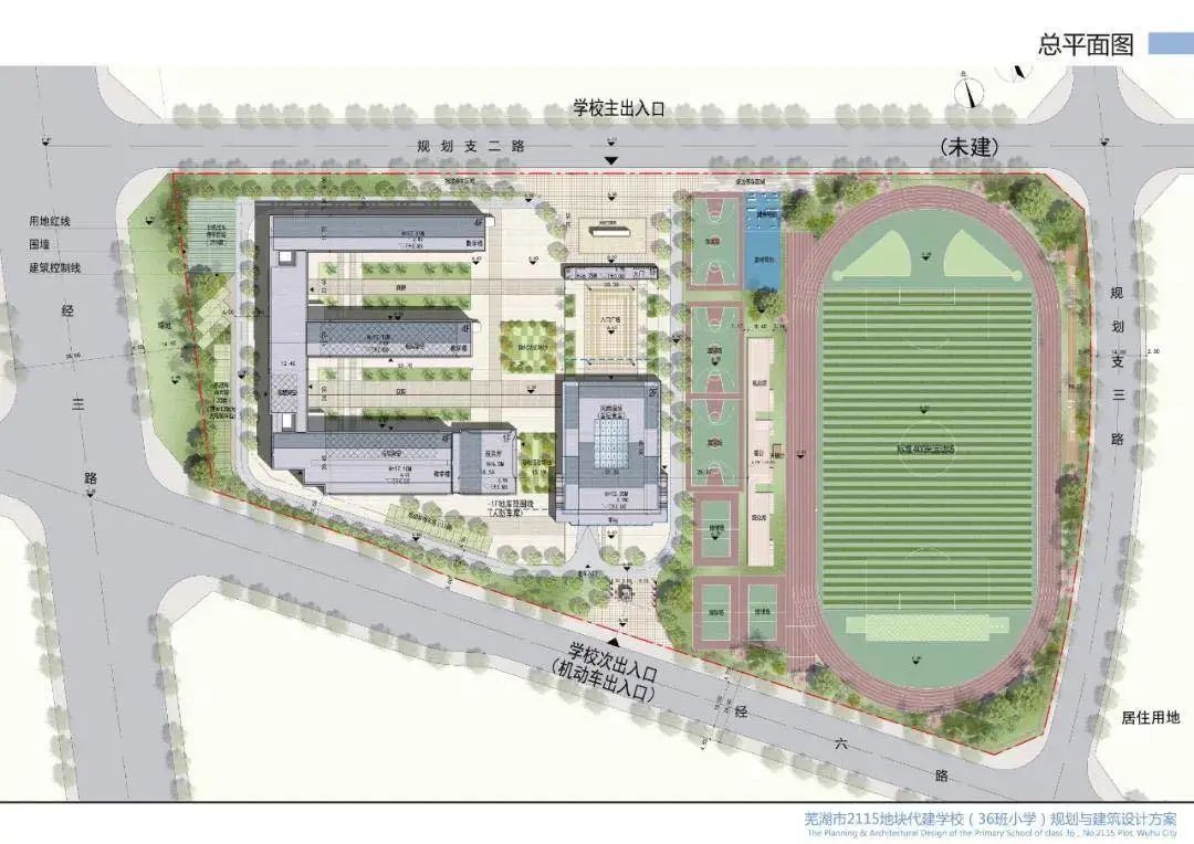 该学校将建设为36班小学,北至规划支二路、南至规划支路、西至规划支三路、东至经五路,项目总用地面积约43177.45㎡。根据规划批前公示,学校规划有3栋4层教学楼、1栋1层报告厅、1栋2层风雨操场+食堂、400米标准田径运动场、篮球场排球场各3处,并设有地下人防车库。