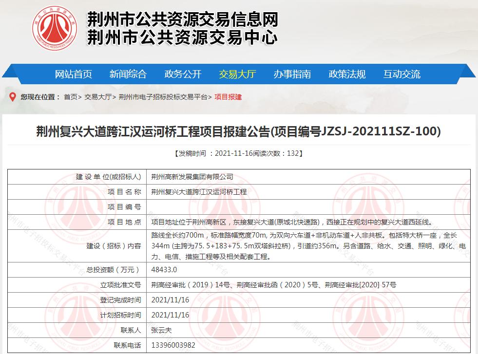 ▲近日,荆州复兴大道跨江汉运河桥工程项目报建公告正式发布。项目地址位于荆州高新区,东接复兴大道(原城北快速路),西接正在规划中的复兴大道西延线。