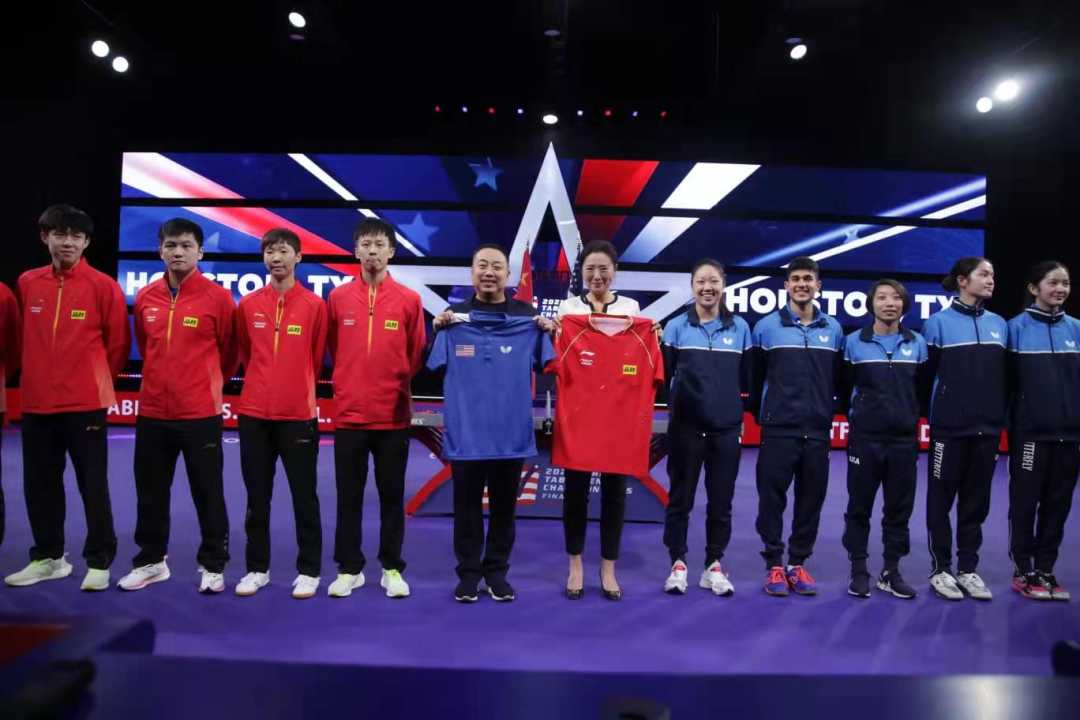 北京时间11月23日,正在美国休斯敦备战世乒赛的中美两国混双跨国配对组合,进行了首次合练,两支队伍也互相交换了球衣。