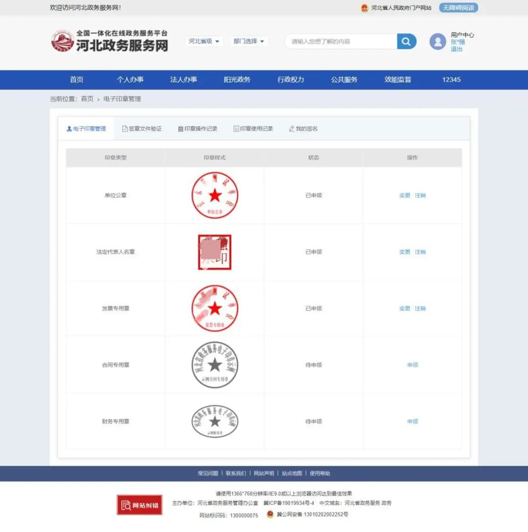 2.使用法人账号登录河北政务服务网,点击“用户名”,进入用户中心,在“我的印章”模块将展示您已经申领的电子印章,点击“申领”,将进入印章申请页面。