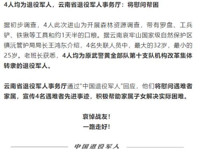 中国地质调查局官网已换成黑白页面,对遇难的4名野外地质调查人员致以沉痛哀悼。云南省退役军人事务厅表示,将慰问遇难者家属,宣传遇难者先进事迹,积极帮助家属子女解决实际困难。