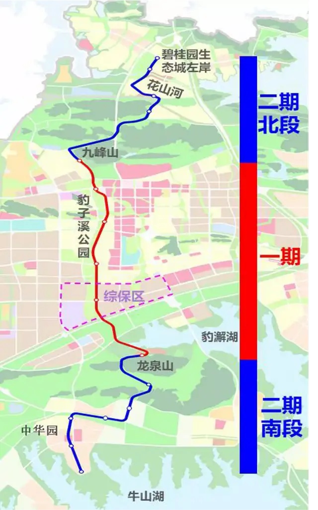 光谷空轨旅游线项目按照总体规划、分期实施原则,先行启动一期工程(九峰山动物园-龙泉山风景区),长10.5公里,设站6座,车辆基地1处。二期工程在一期基础上,向北连接严西湖、严东湖,向南连接豹澥湖、牛山湖。