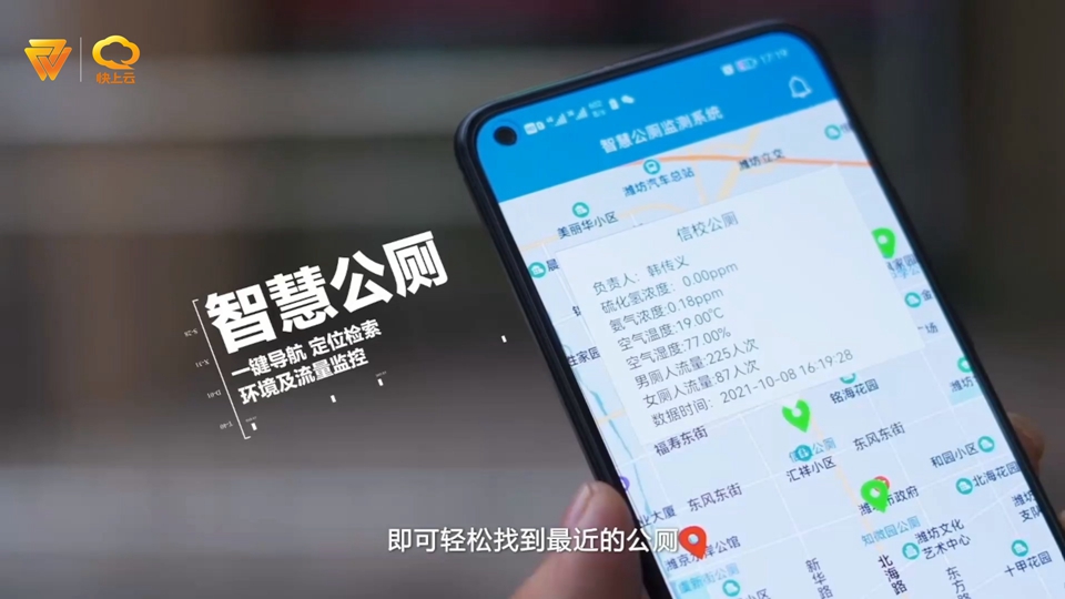 智慧公厕。潍坊上线公厕地图,将主城区655个24小时公厕和限时共享公厕在一张地图展现,为市民提供定位检索、一键导航服务。通过物联网设备,对公厕空气质量情况等进行监测并进行分析预警。