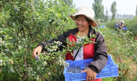 灌云伊云贝尔蓝莓基地,工人在采摘蓝莓。