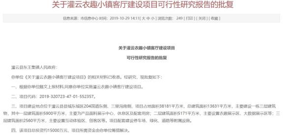 关于灌云衣趣小镇客厅建设项目可行性研究报告的批复.来源/灌云县人民政府官网