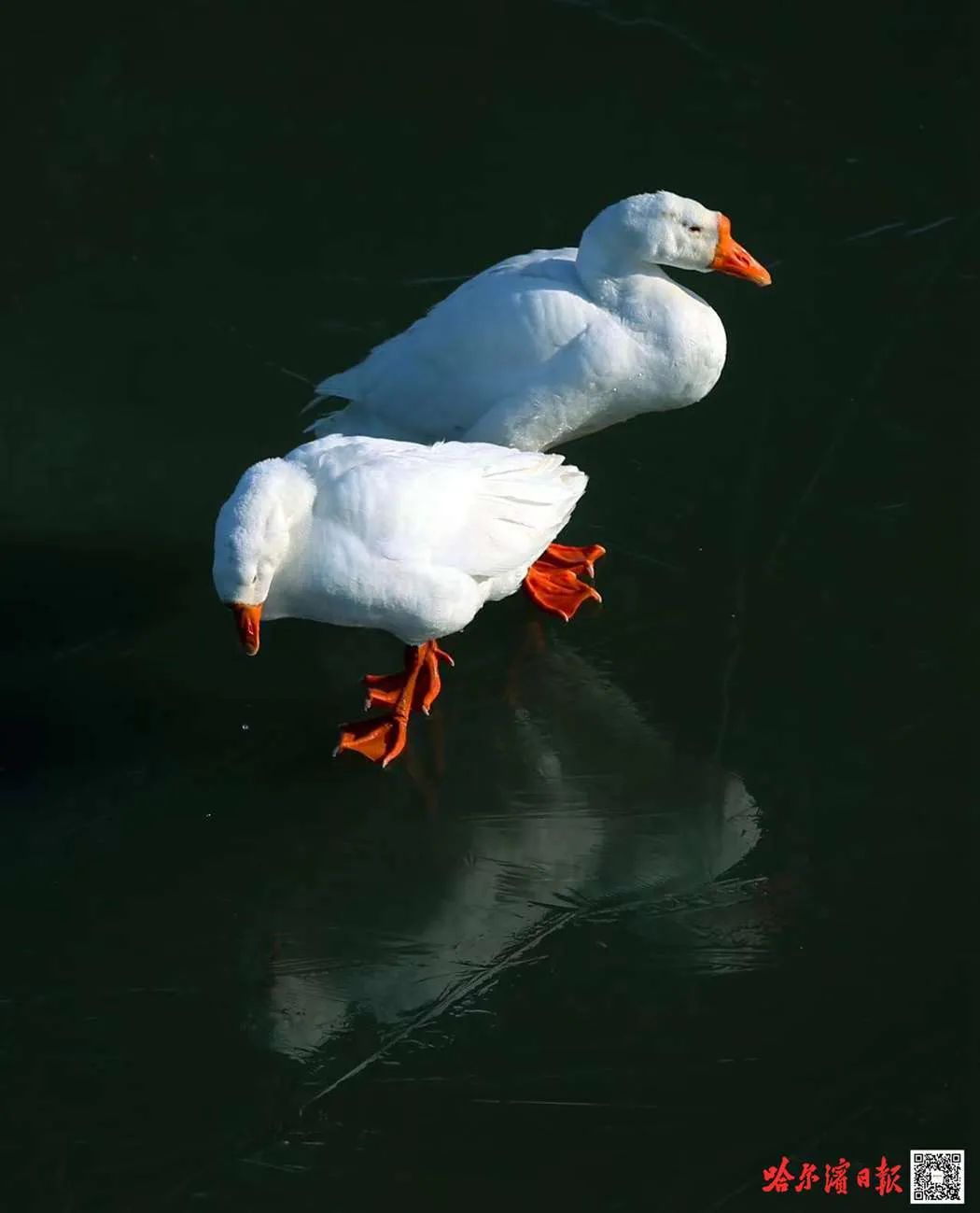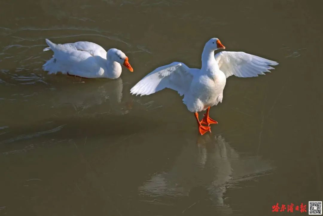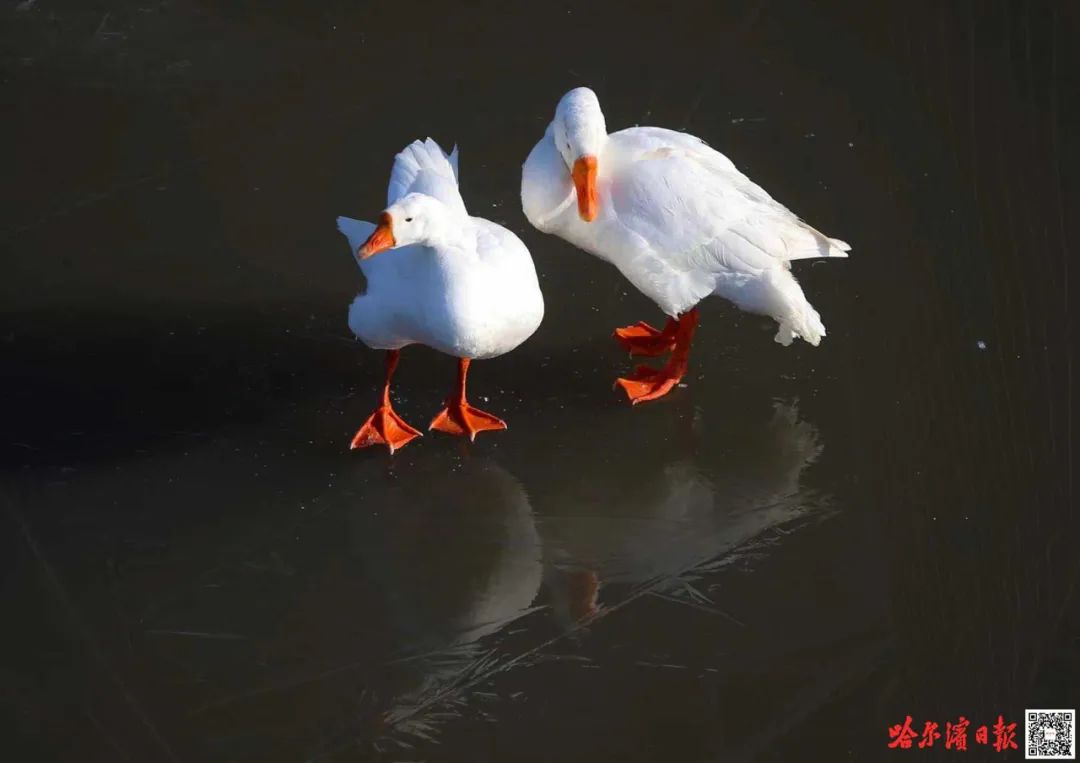 中午11时许,哈尔滨日报社手机记者宋永国在江边发现,靠近滨洲铁路桥江南一侧桥下,距离岸边大概100米远,有两只鹅在水面上活动。这里全是冰雪,只有一小片没冻的水面,它们就待在那里不走,时而悠闲地划划水,时而到冰上走两步,还总相互依偎晒亲密,引来一些人在岸上驻足围观。有人说这是白天鹅,不知道从哪里飞来的;也有人说是普通的家鹅,因为没见过它俩飞过。