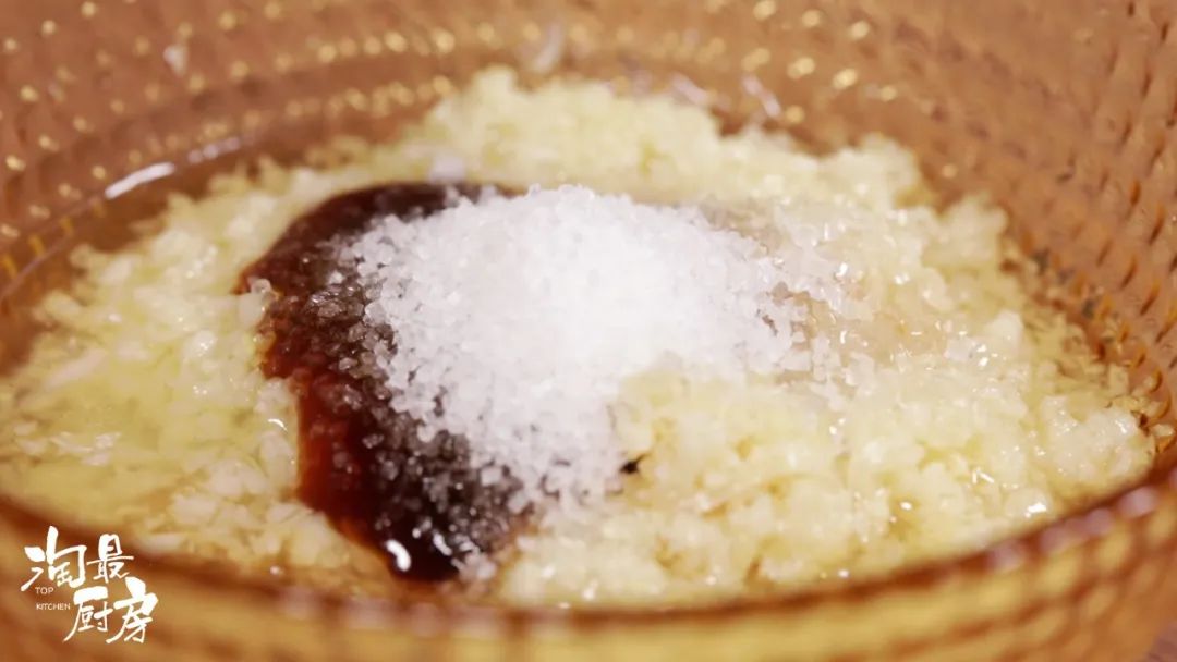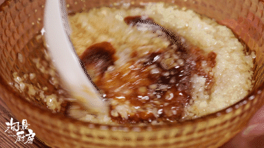在蒜泥中淋上热油(8成油温),加入1调羹(15ml)生抽、1调羹(15ml)蚝油、0.5调羹(7.5g)盐、1调羹(15g)糖,搅拌均匀。