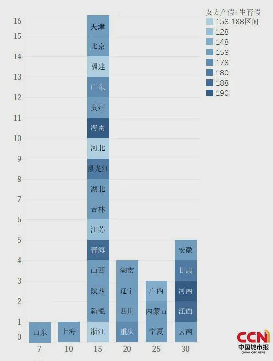 各地男方护理假天数分布情况。这些地方增设男方护理假