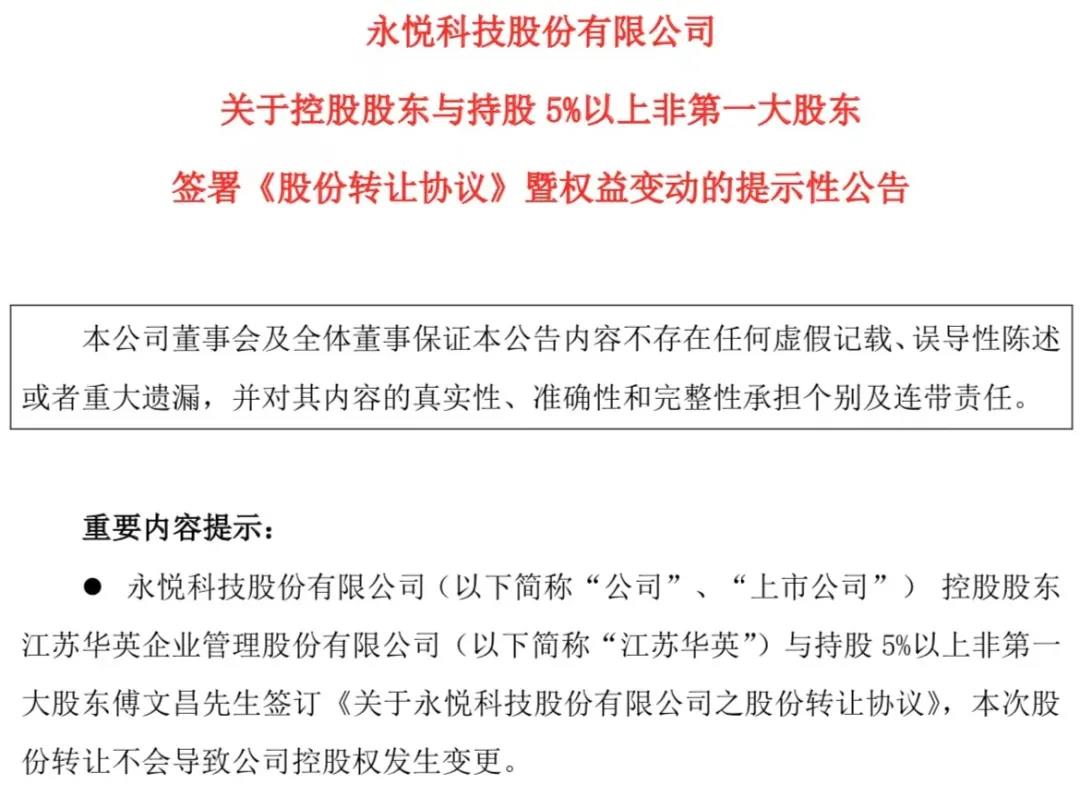公告显示,协议转让之后,江苏华英将持有永悦科技1.08亿股,占总股本的29.75%。傅文昌及其一致行动人直接合计持有3819.05万股,占总股本的10.54%,傅文昌本人直接持有1169万股,占总股本的3.23%,不再为持股5%以上非第一大股东。本次协议转让不会触发受让方的要约收购义务,也不会导致公司控股股东及实际控制人发生变化。
