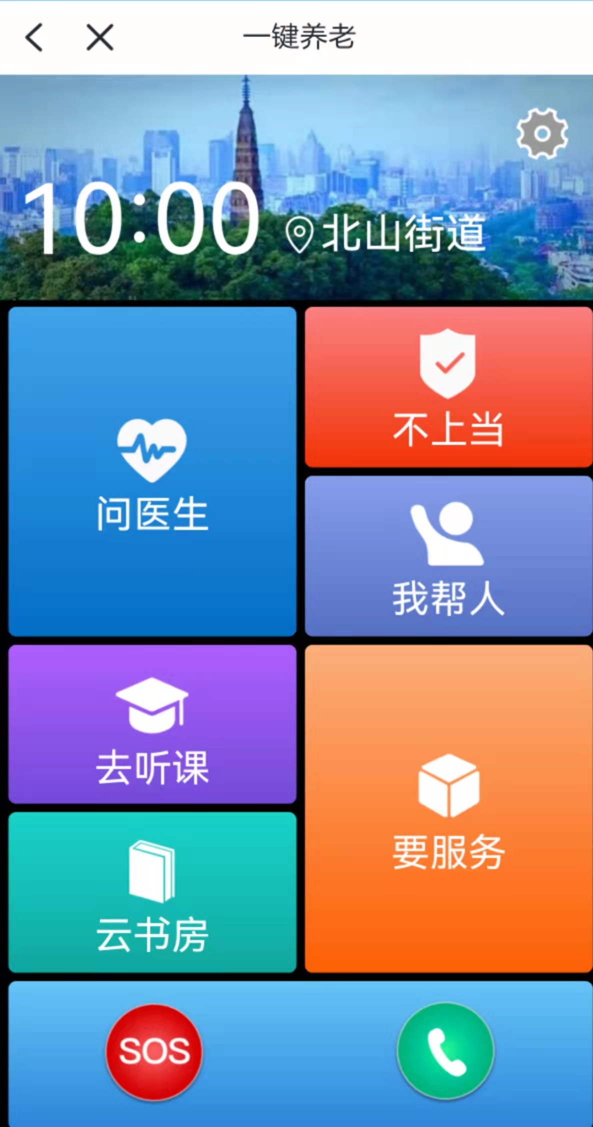 打开“浙里办”APP,点击“一键养老”应用场景,随即进入简洁清晰的主页,包含了“问医生”“不上当”“去听课”“云书房”等模块,主页尾端还设置有“SOS”求救按钮和电话急求热线。