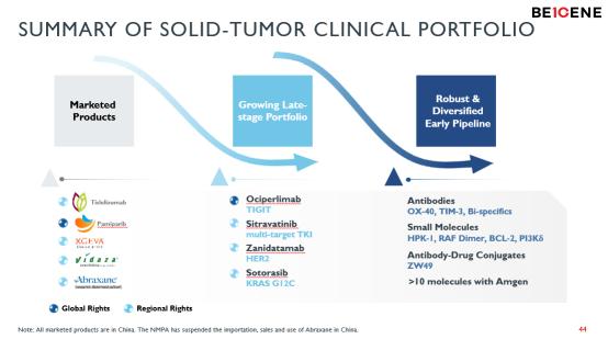 实体肿瘤领域中,已上市的PD-1替雷利珠单抗除了目前在中国取得的5项批准外,还在多个领域开展临床试验,包括11项注册性临床研究,持续拓展在更多适应症中的潜力;TIGIT抗体Ociperlimab当前在全球TIGIT赛道的竞争中正处于领先地位,当前已开展两项联合PD-1的全球临床3期试验,以及多个2期临床研究;此外还有BGB-A445(OX40)、HPK-1、Sitravatinib、Sotorasib(KRAS G12C)等多款具备差异化的产品,构建起了一支全面、系统性的肿瘤免疫管线。