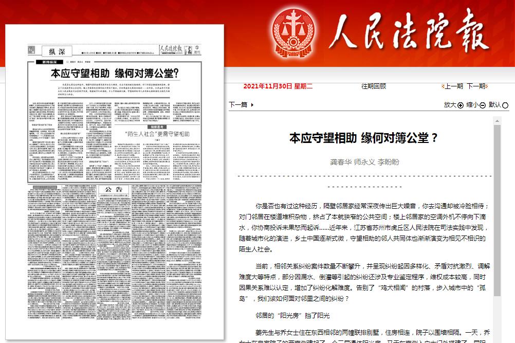 2021年11月30日《人民法院报》第06版你是否也有过这种经历,隔壁邻居家经常深夜传出巨大噪音,你去沟通却被冷脸相待;对门邻居在楼道堆积杂物,挤占了本就狭窄的公共空间;楼上邻居家的空调外机不停向下滴水,你协商投诉未果怒而起诉……近年来,江苏省苏州市虎丘区人民法院在司法实践中发现,随着城市化的演进,乡土中国逐渐式微,守望相助的邻人共同体也渐渐演变为相见不相识的陌生人社会。