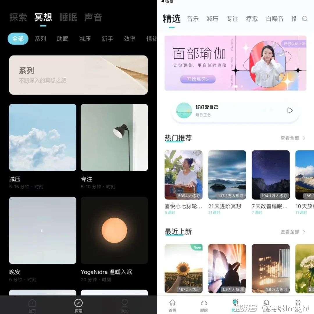 除了主打冥想的平台逐渐增多,头部健身机构、健身APP也开始关注冥想的需求,Keep、每日瑜伽等健身应用都上线了冥想功能和课程。