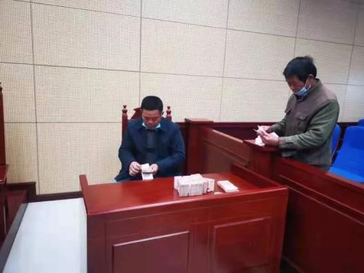 图为老李当庭向B合作社支付相关费用面对这一难题,承办法官通过庭前与老李及A镇政府、B合作社沟通,庭审中邀请政府负责人、合作社成员、代理人等共同参与调解,耐心细致的做思想工作,为各方阐明移除地上附着物的难度和可能性结果,有针对性地促成当事人达成较为合理的调解方案:在A镇政府同意的情况下,B合作社转让与A镇政府签订的土地承包合同下的所有权利及义务,由老李在同等条件下享有及承担;老李需支付B合作社为承包土地支出的合理费用并对B合作社作出补偿。在承办法官的建议下,三方当事人就案涉现金款项当庭进行了兑现。