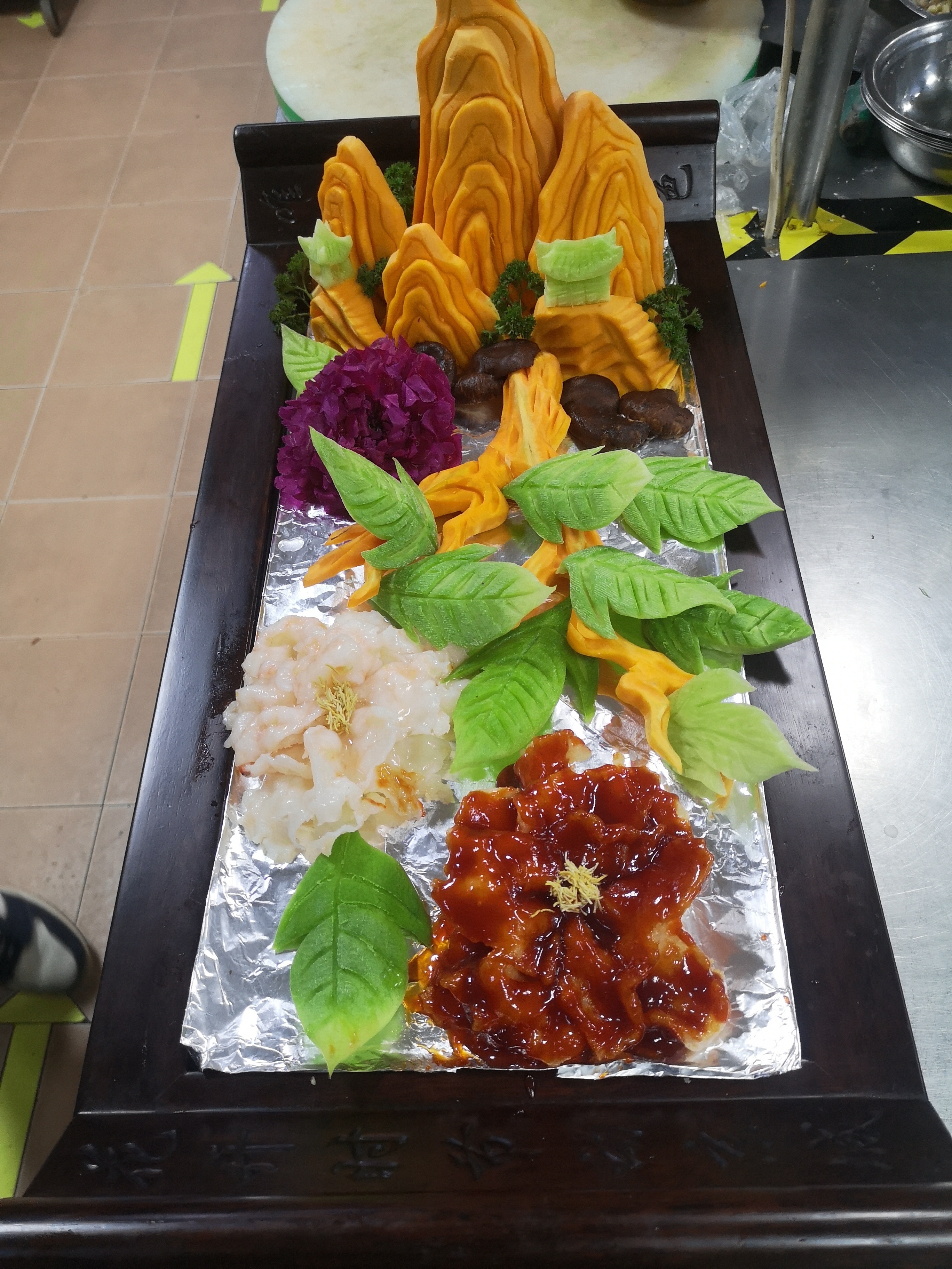 500克明虾作主料,铁棍山药、青萝卜、南瓜、香菇、香芹为辅料,看似普通的食材,在李传递手中却能“化腐朽为神奇”。只见他手握剃刀,上下翻飞,由南瓜雕刻成的菏泽金山、小桥、亭子,栩栩如生,用青萝卜雕刻成牡丹的枝、叶更是碧绿青翠、难辨真假。
