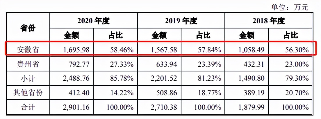 业内人士表示,晶奇网络市场占有率低或许是其业务区域相对集中所致。招股书显示,2018年-2020年,晶奇网络来自安徽地区的收入分别为1058.49万元、1567.58万元和1695.98万元,占比分别为56.30%、57.84%和58.46%,安徽地区收入占比较高。