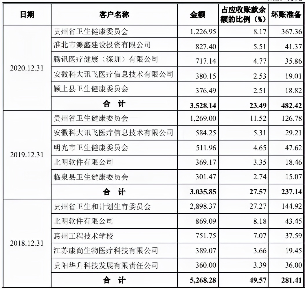 进一步的数据表明,2018年-2020年,晶奇网络前五大客户的欠款金额分别为5268.28万元、3035.85万元和3528.14万元,占应收账款余额的比例分别为49.57%、27.57%和23.49%,包括贵州省卫生健康委员会、北明软件有限公司、安徽科大讯飞医疗信息技术有限公司等客户。