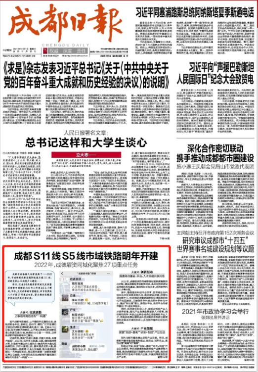 据成都日报报道,作为成都都市圈发展的重要支撑,轨道交通市域铁路成都至眉山S5线和成都至德阳S11线,将于2022年开工建设。