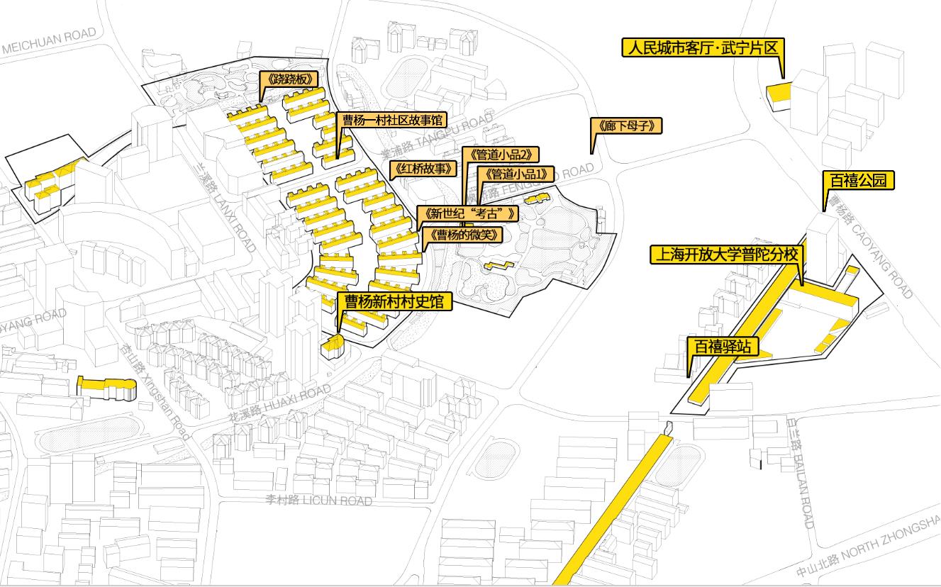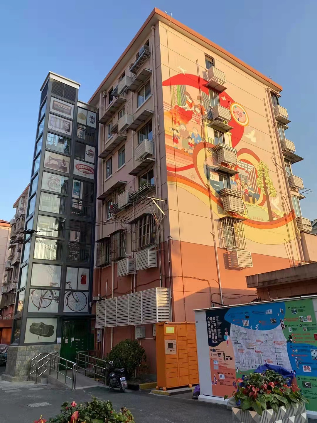 静安区样本社区展临汾路社区的情况就很适合与南昌路进行比较。该社区位置偏北,离地铁站也不太近,一些旧的居住小区还在拆建当中,我去参观那天其好赶上彭浦一村旧房屋拆除。在新村类小区集中成片的老社区,艺术季何为?临汾路的展示都很微小,艺术作品以共建的美术学院学生作品为主,看得出大家尽力想让作品与本社区建立一些关联。这些对本社区属于锦上添花,现在用来串联参观路线,构成漫步景观,社区更新的重点放在几十个公共服务空间的建设上,包括社区党群中心、学校、医院、菜场等,以及近年广受关注的老旧小区加装电梯工程上。临汾路样本社区展是一个十分本分的展。与之做法相似的是闵行区梅陇样本社区展,也没有安排专门的集中展示空间,就是推出新建、新改造的创意园区力波1987和社区“公益总部”益梅小院等,把15分钟生活圈规划中的主要点位夯实一下。