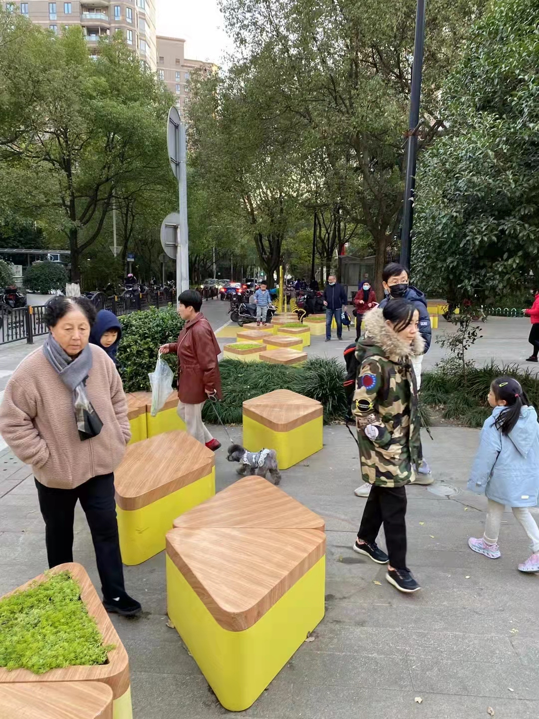 最后,我想说一下长宁区虹桥样本社区展的启示。上海是一个多层次、动态变化的超大城市,除了老旧小区更新,较新的小区、新城的小区也面临要不要更新和怎样更新的问题。黄金城道是虹桥样本社区展的主要场地,当然,该展启动时间较晚,似乎组织、宣传上也较为独立,有多个其他的合作机制在进行支持,还有别的展区没开展。在黄金城道既有的展项上,我看到的主要是联建商户的名单和商业街步行空间上的若干小微更新,主要包括景观小品、智慧城市设备、街道家具、小型空间等。在古北市民中心主展区,也并没有安排某种主题展览。去一次,好像没看到多少展品,但又确实看到了这块街区。我是11月下旬去的,黄金城道已经银杏叶飘动,人们簇拥着年轻的姑娘、可爱的小朋友、活力四射的宠物,在“老法师”们的镜头下摆着各种pose。这是这条街道的常态。这里的小区主流是品质较高、建设较晚的,15分钟生活圈底子好,规划想必侧重点不同。延伸可知,做展览的目的和角度也会不同。