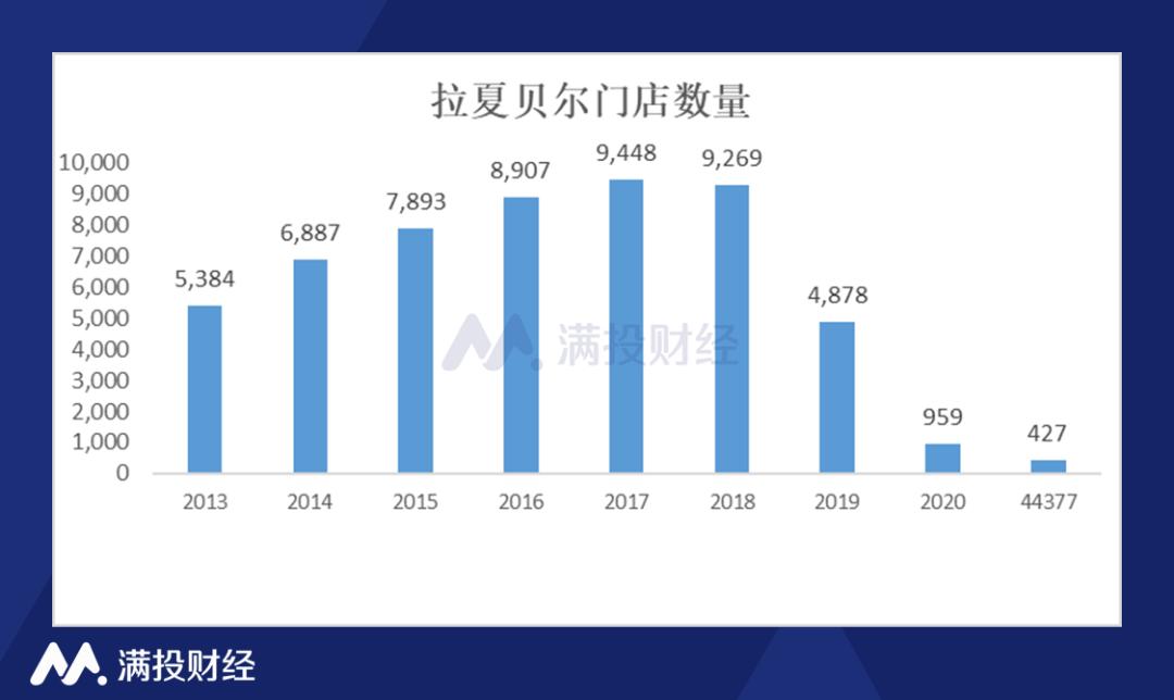 截至2021年6月30日,拉夏贝尔的线下门店从2017年年底的9448家减少至427家,关闭的门店高达9000多家。拉夏贝尔是如何被拉下神坛的?