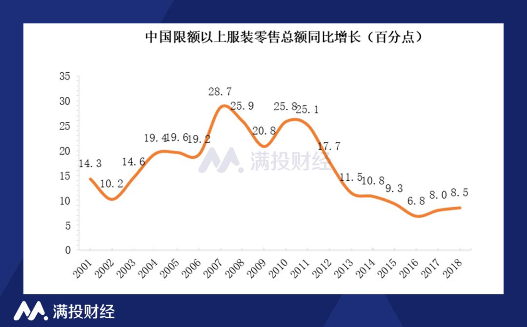 再来看中国服饰市场的环境变化,以服装零售总额(限额以上企业)计算,中国服装行业在 2006-2012 年期间,有过一波快速增长。期间服装行业总体增速在20%以上,在此期间,各国外资服装品牌纷纷进入中国市场,享受快速增长的行业红利。2015年之后,中国服饰行业整体增速减缓,在6%-8%之间,行业发展到这个阶段,野蛮式的扩张已经行不通,更需要精细化的运营和高效率的发展。