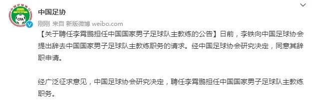 12月3日下午,中国足协正式宣布,同意主教练李铁的辞职请求,武汉卓尔队主帅李霄鹏成为接任者。值得注意的是,李霄鹏成为中国足球史上首位执教过中国男女足国家队的主帅。