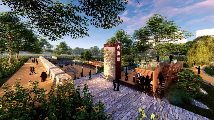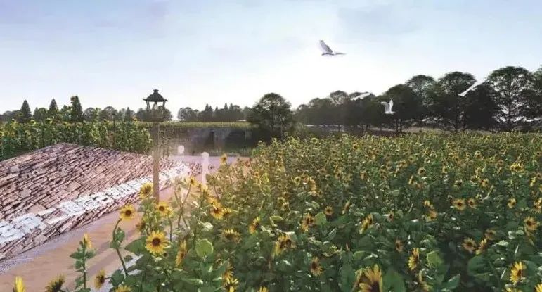 在前期设计中特别预留了古海塘遗址放置区,将其打造成古海塘景观节点,位于中心湖东侧,可完整呈现80米海塘的整体构造,最大化保护省级文保文物的完整性。湖畔种植有向日葵、油菜花花海,沿湖岸漫步,风光无限。