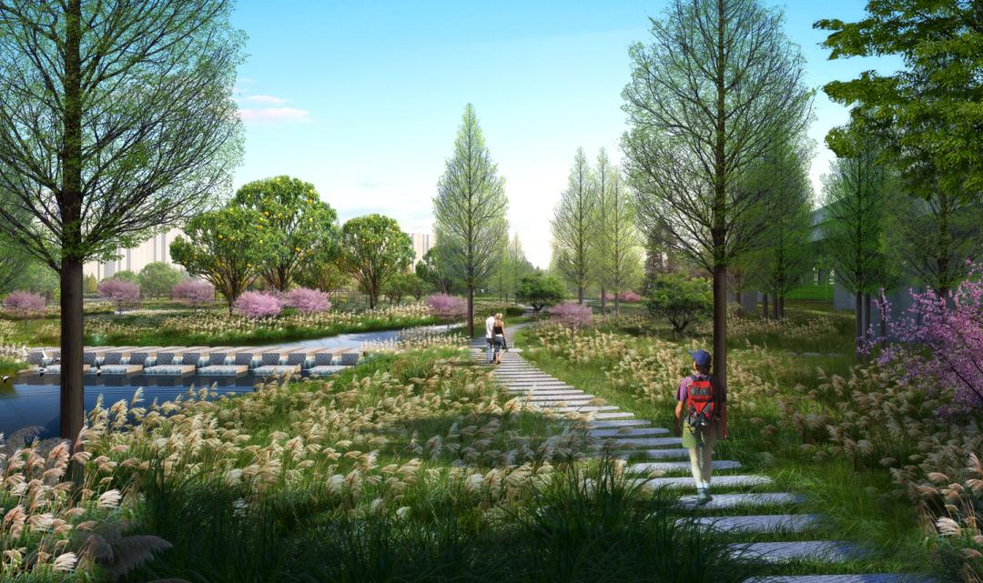 按照总体设计,公园将形成“一轴一心三区八景多节点”的景观结构。以生态湿地景观轴为核心,将公园分为三个区域,分别是湿地科普区、活力休闲区、门户形象区,此外还设有中心湖、古海塘、芦花岛、雨水花园等多个景点。