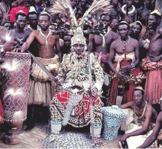 他身披白袍,拿着五彩斑斓的权杖,和尼日利亚的朋友们合影。