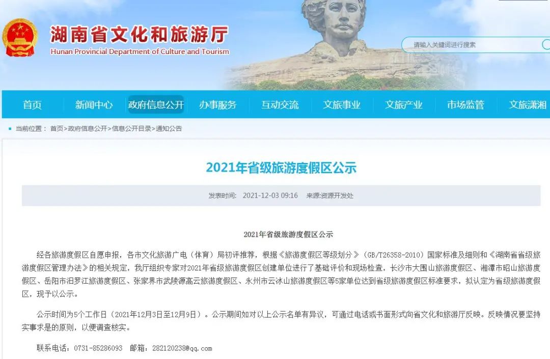 好消息!好消息!近日,2021年省级旅游度假区正在公示,包括5家单位,他们是长沙市大围山旅游度假区、湘潭市昭山旅游度假区、岳阳市汨罗江旅游度假区、张家界市武陵源高云旅游度假区、永州市云冰山旅游度假区,分布在长沙、湘潭、岳阳、张家界、永州5市。