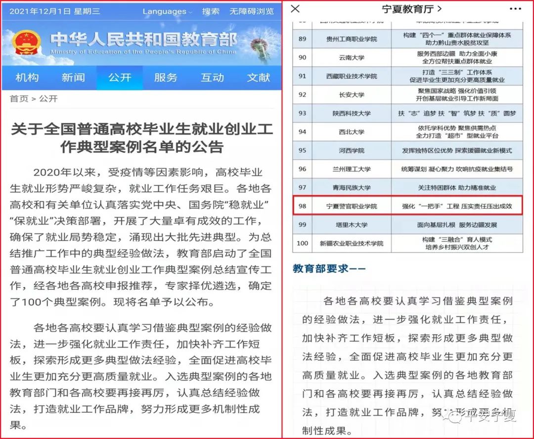 原标题:《宁夏警官职业学院毕业生就业创业工作入选全国高校100个典型案例》